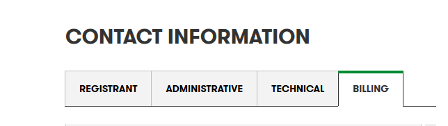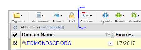 This example is from GoDaddy. After logging in, look around for your account information. In this spot, when you click on ‘Contacts’, you’ll be taken to the screen below. Here you can have up to four people’s names, and contact information on file. These can be changed as people come and go in your organization or team. Make sure your name is in at least one of these sections.