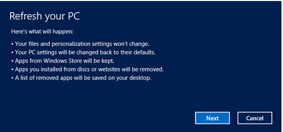 You’ll go through some screens and you’ll see the below screen that tells what happens with the Refresh command. Just keep clicking next until your computer starts the refresh process.