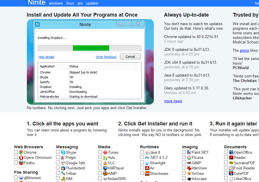 I wanted to be back up and running fast, so I remembered this really helpful software called Ninite. I have a screenshot below. This is totally web based (no downloads), just go to the site, click the boxes for the software you want to install and sit back and wait – they do all the heavy lifting and show you what’s being installed. It was truly such a time saver. It even reinstalled Dropbox, FileZilla and other obscure-type programs that most people probably don’t have.